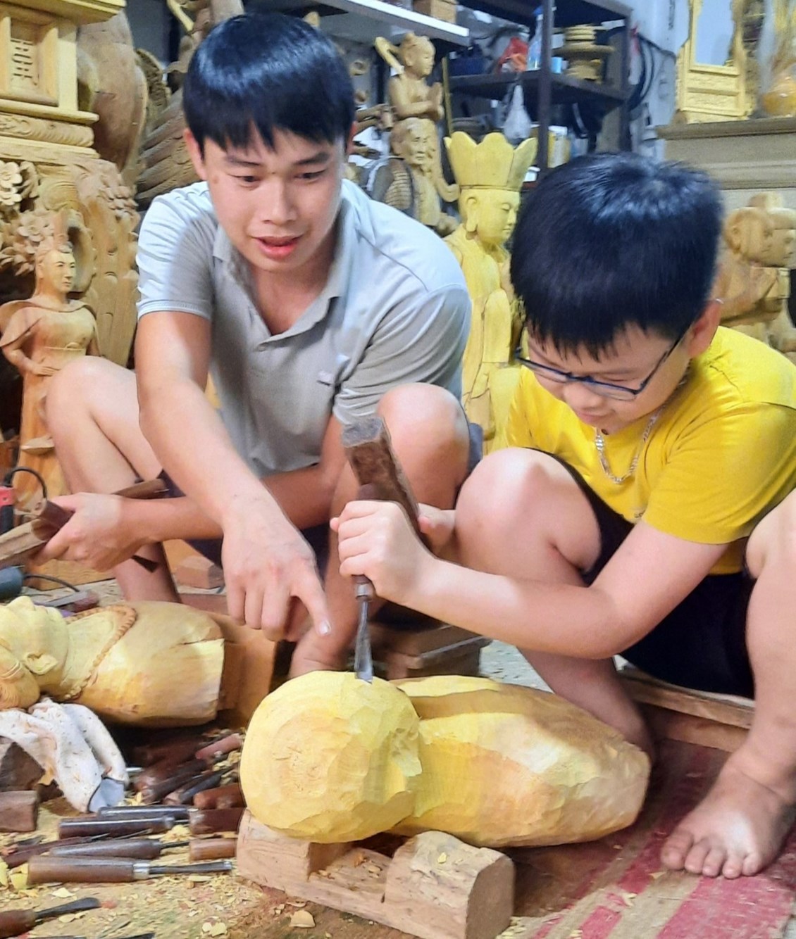 (Quang Hà đang được bố truyền nghề tạc tượng)