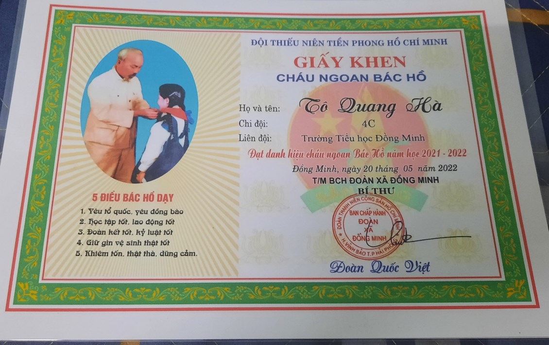 Vì vậy mà trong các bài kiểm tra, các kì thi cuối năm học, em luôn đạt kết quả tốt. Bốn năm liền, em đạt danh hiệu: “Hoàn thành xuất sắc các nội dung học tập và rèn luyện”.