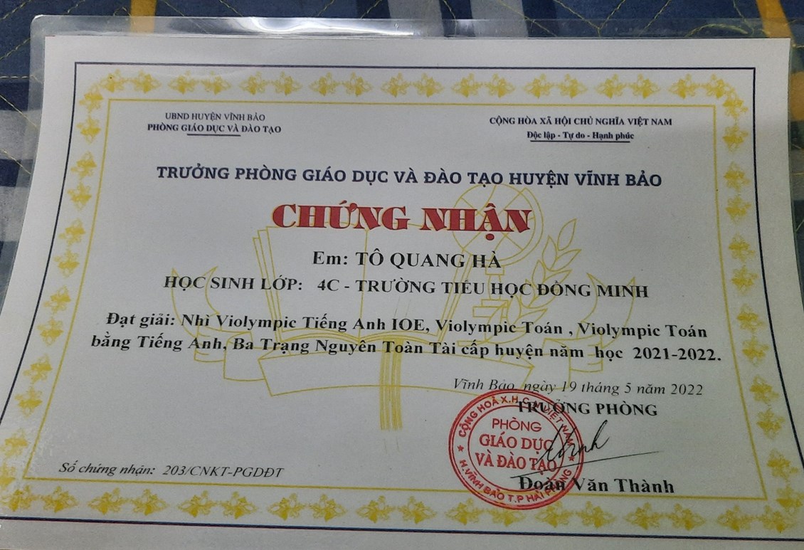 Năm học 2021-2022 em đã đạt giải Nhì violympic Toán bằng Tiếng Anh, giải Nhì violympic Toán bằng Tiếng Việt, giải Nhì IOE.